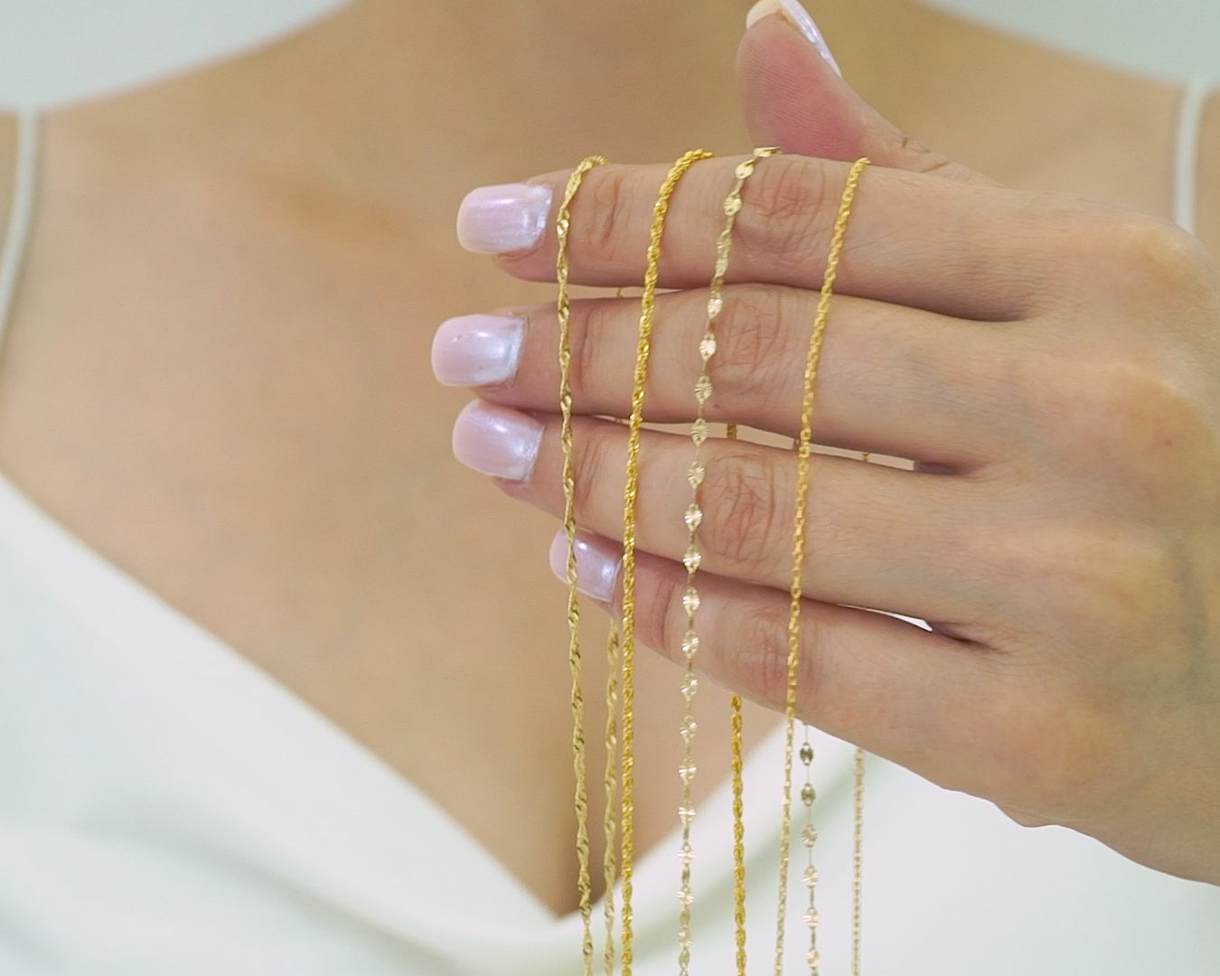 Model 4: Singapore Chain: A delicate, twisted design with fluid links that create a shimmering effect, ideal for adding elegance to any outfit.